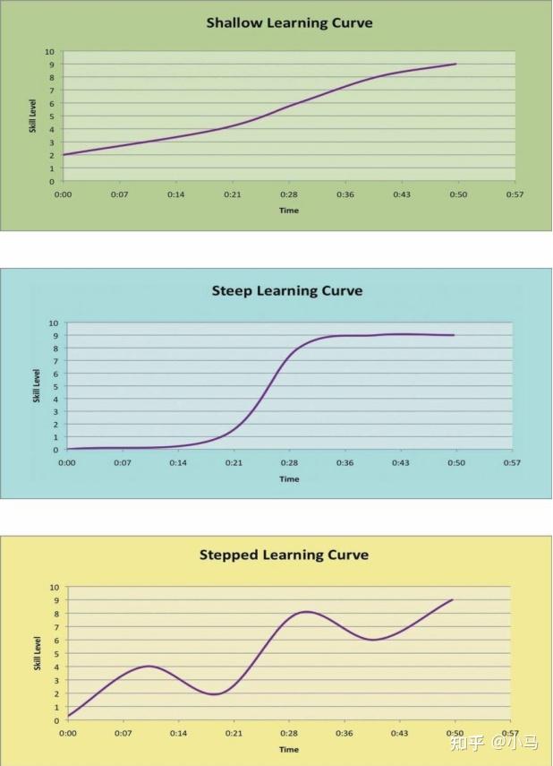 完成一个任务需要付出时间,付出努力去理解它,而在不断重复该任务的过程中技能将随之得到提高。学习曲线(Learning Curve)就是把这个意思可视化了。学习曲线能够表示个体玩家的技能进步(如:“由于她玩过其他即时战略游戏(real-time strategy game, RTS),在玩我们的游戏时她的学习曲线很平滑。”),也可以体现某些游戏细节的上手难度(如:“要记住这么多的按键命令让这个游戏刚开始的学习曲线就很陡峭。”)。幸运的是,对游戏设计师(国内公司通常称为游戏策划)而言,学习曲线所代表的玩家和游戏之间的关系是可调节的。