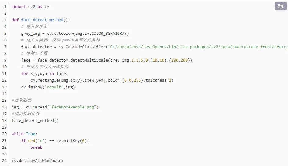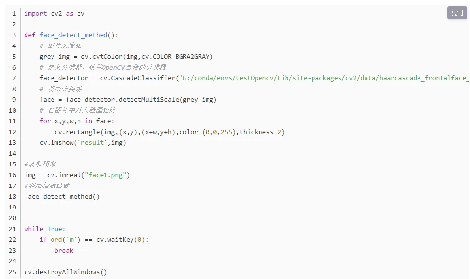 使用cv.CascadeClassifier(参数:分类器所在路径)方法定义一个分类器对象。