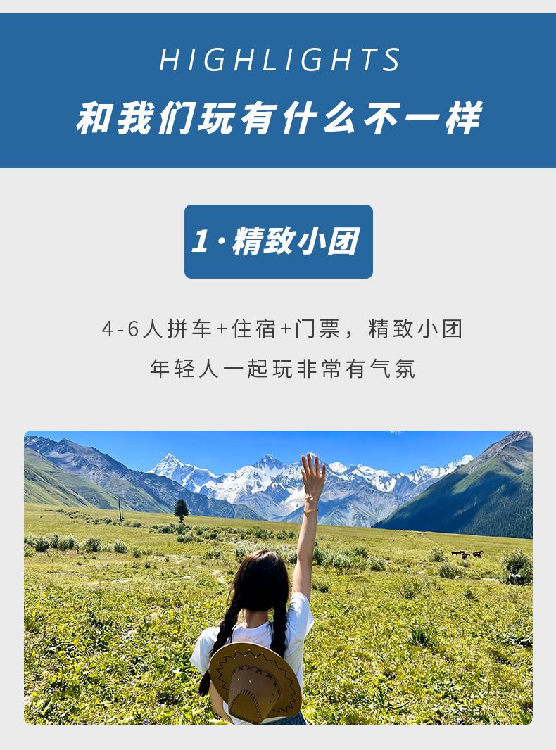 这里视野开阔,水草丰美,是哈萨克族居民的夏牧场。自由活动:远观雪峰冰川,近看草原花海,在洁白的哈萨克毡房里喝一碗暖暖的奶茶,再骑乘天马,扬鞭驰骋,寻觅天山深处雪莲的芬芳