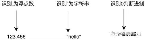 因此对于整数、小数等常量的识别就显得非常简单。如图3-2所示,整数就是字符中全是“0”~“9”的数字,浮点数就是字符中有“.”号的数字,字符串的首字符为"或'。