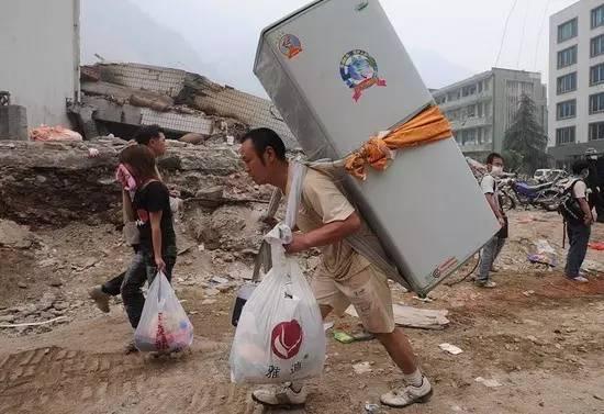 5月17日,北川县城,当地居民在废墟中搜寻尽可能用的家当带走。(图片来源网易论坛)