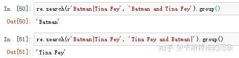 字符'|'称为管道字符,匹配许多表达式中的一个时,第一次出现的匹配文本,将作为match对象返回(换言之,search()方法返回的match对象对应的只是被查找字符串中第一次匹配的文本,而多个表达式只是看谁才是那个第一次匹配的文本)