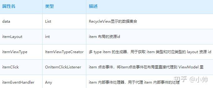 通过 DataBinding 的 BindingAdapter 扩展了 RecycleView 一系列属性,用于在 xml 布局中对 RecyclerView 进行快捷配置,无需编写 java/kotlin 代码即可完成对 RecyclerView 的全部配置,包括列表数据、item 布局、事件等,具体可配置属性如下: