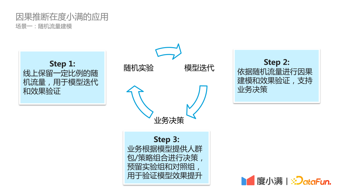 第二步是拥有了一定的随机流量后,可以依赖随机流量去进行因果模型的建模和离线效果的预估,从而支持业务的决策。
