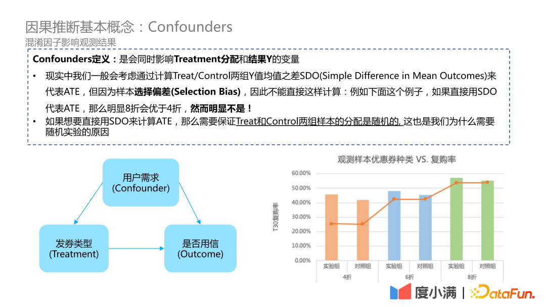 由此引出了因果推断中另一个关键的概念: 混淆因子(Confounders) 。定义为:会同时影响 Treatment 分配和结果 Y 的变量。在实际的线上 A/B 实验中,我们经常会将实验组和对照组结果均值的差异作为实验效果的评估。但是线上实验并不完全随机,而是具有倾向性。