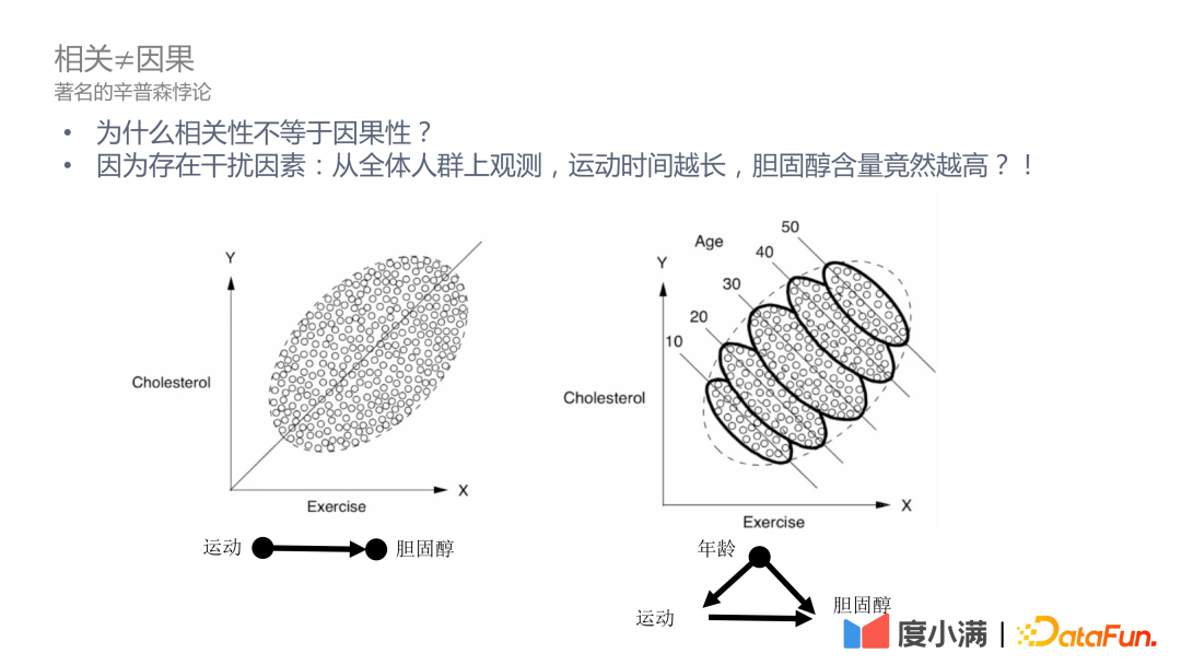上图解释了相关和因果的关系 。左图从整体人口的角度去观测,随着运动量提升,人体内的胆固醇增加,显然违背常识,原因是观测数据中存在干扰因子。在这个例子中年龄是干扰因子。当我们对年龄进行控制,在不同的年龄分段,人的胆固醇的含量会随着运动的增加而减少,符合我们的认知事实。