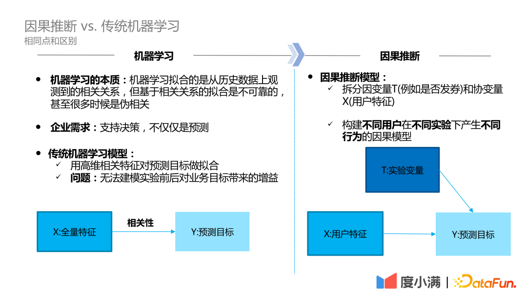 从上图可以看出,传统的机器学习是预测工作,即拟合用户的高维特征与 Y 值之间的相关性,但是相关性有时不能支持决策。因果推断是先拆分因变量 T(例如是否发券)和协变量 X(用户特征),然后构建不同用户在不同实验下产生不同行为的因果模型。