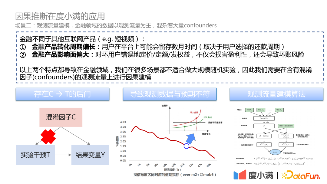 更多场景是:在含有较多混淆因子的观测流量上进行因果建模。在观测流量上面,因为混淆因子的存在,出现了混淆因子 C 到实验干预 T 的后门,但是我们偏好 C 到 Y 和 T 到 Y 的因果关系。由于后门的存在,在观测流量上观测不到具有因果关系的正常表现。在金融领域,对于好用户,当额度产生变化,好用户逾期的弹性较好;对于坏用户,理想状态将会观测到坏用户的逾期曲线随着额度的变化更加陡峭。