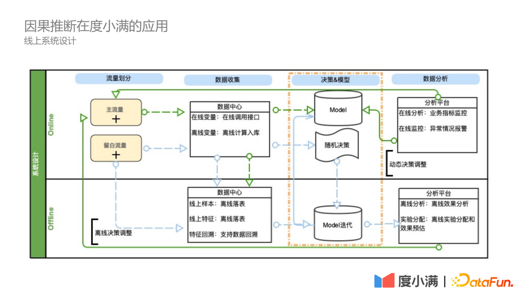上图表示度小满典型的可支持因果建模和决策的线上系统设计图 。这个因果决策系统分为四个重要部分,依据线上线下,两块具有不同的工作。