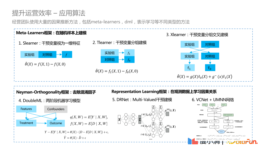 大量的混淆因子观测流量上的建模方式不同于随机实验,我将介绍几个在实战中使用较多的算法框架。度小满进行算法选型时,基本逻辑是考虑样本是否含有随机流量。如果样本是比较好的随机实验,可以用 Meta-Learner 框架解决问题。