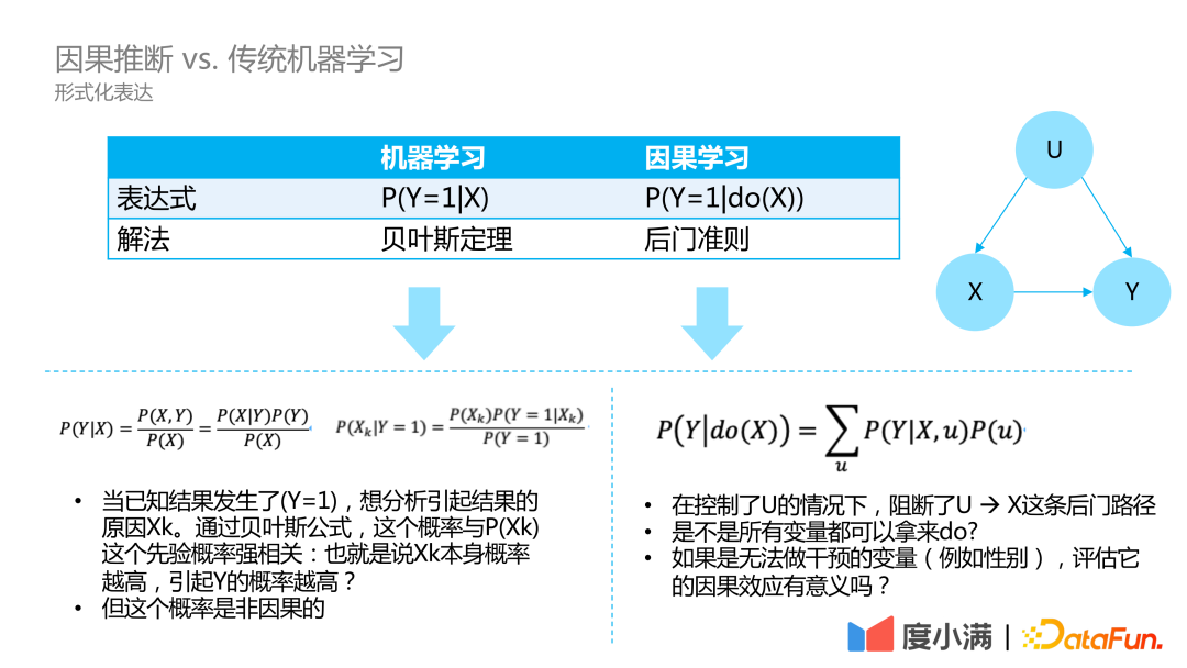 传统机器学习采用贝叶斯定理进行求解 ,而右图反应了一个典型的因果学习,U 是混杂因子 Confounder,U 既会影响 X 的分布,也会影响结果 Y 的分布。因为 U 到 X 之间后门路径的存在,导致观测数据不能体现出正常的因果关系。