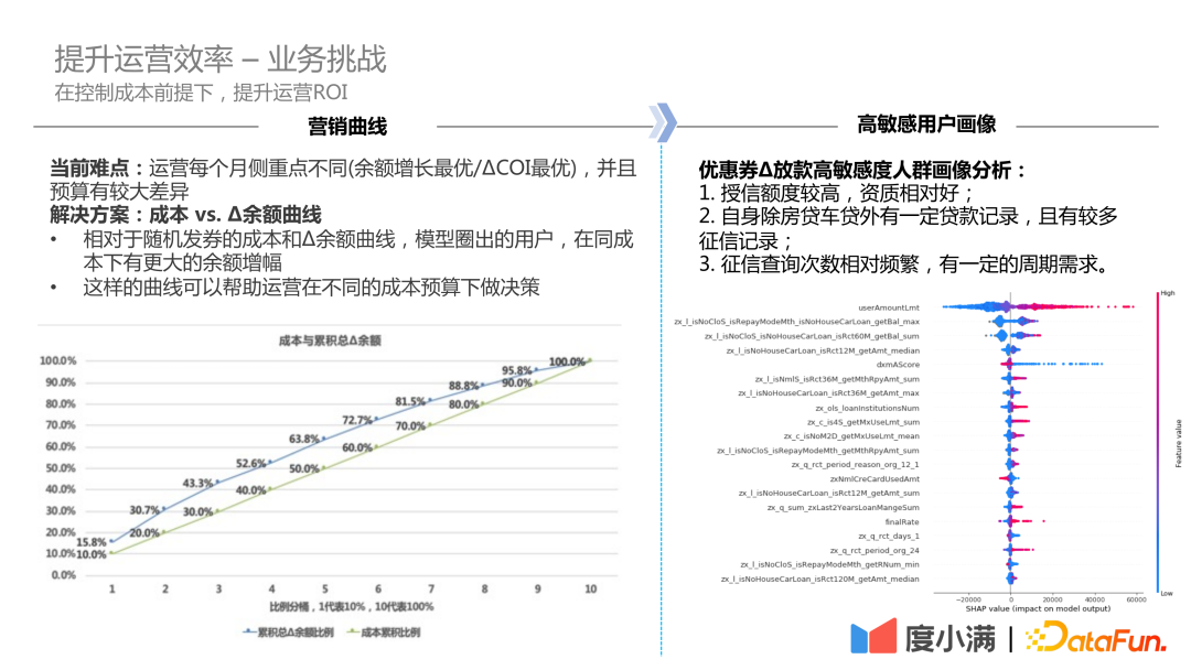 第二个问题是解释性问题 ,如右图,当给出人群包,目标是分析究竟是什么因素让它用户变得对营销更敏感。关于这个问题,我们对敏感性进行归因。可以发现平台高敏感的用户,本身资质比较好,授信额度比较高,有稳定的外部需求的。对比过其他的用户,有些用户时具有临时需求,具有突增性的一些需求,这时发券会引起较短时间内人头的提升,对长期而言,它还不如有稳定需求的用户。