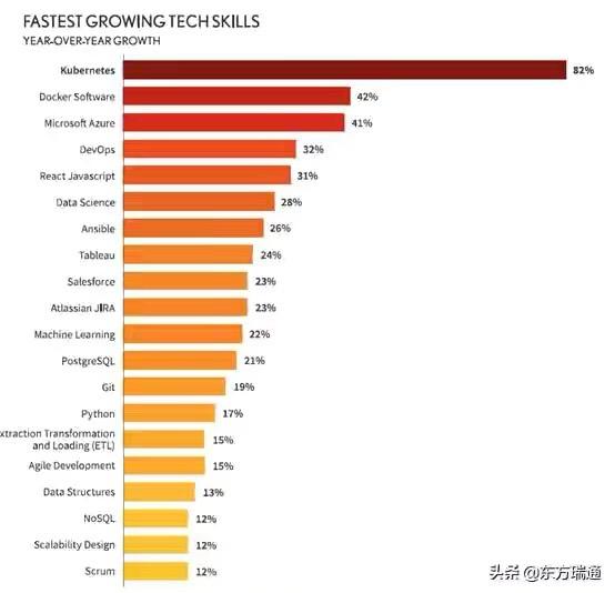 Dice在这份报告中指出:“容器化一直是过去这几年的热点。Docker是一种特别受欢迎的容器管理工具。鉴于容器的普及,Kubernetes同比涨幅为82%也并不出乎意料,预计未来10年,K8S增幅将超过67%。