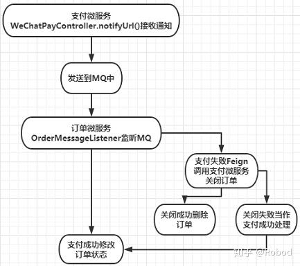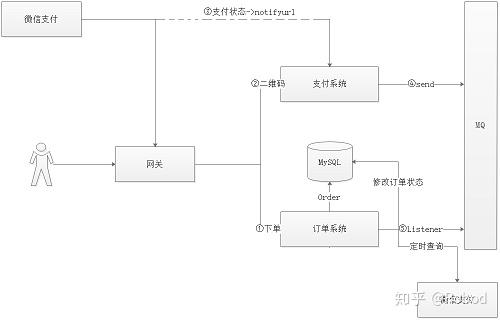 当创建一个订单后,可能用户并不会去支付,或者是因为网络的原因导致我们获取不到用户支付的结果。所以可以采用定时处理的方式,具体的操作就是下单成功后就往mq的队列1中发送一条消息,设置30分钟过期,过期后将消息发送给队列2,然后我们监听队列2。这样一旦监听到了队列2的消息,则说明离下单已经过去了30分钟,这时候我们去查询一下订单状态,如果是已支付就不去管它,要是未支付的话就通知微信服务器关闭订单,然后从数据库中删除订单。为了方便理解,我画了一张流程图: