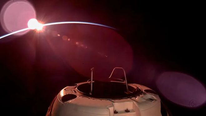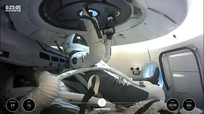 在宇航员们穿上舱外宇航服后,SpaceX正式开始直播,画面分享了龙飞船太空舱内部的景象。可以在背景中看到波蒂特坐在座位上,而任务指挥官艾萨克曼则飘浮在空中,连接着一条“脐带”。