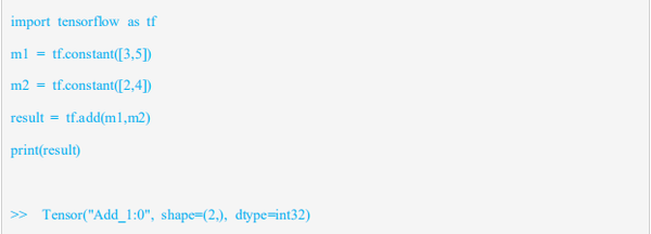 程序1定义了图的构建过程,“import tensorflow as tf”,是在python中导入tensorflow模块,并另起名为“tf”;接着定义了两个常量op,m1和m2,均为1*2的矩阵;最后将m1和m2的值作为输入创建一个矩阵加法op,并输出最后的结果result。