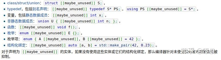 抑制对未使用实体的警告,实体包括类型(struct,class,union)、别名、变量、非静态数据成员、函数、命名空间,枚举类型、枚举类型、结构化绑定。