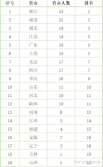 第三梯队的湖北、江苏、广东、上海、北京、四川、重庆距离相差就不是很大了,人数在16-19人之间。