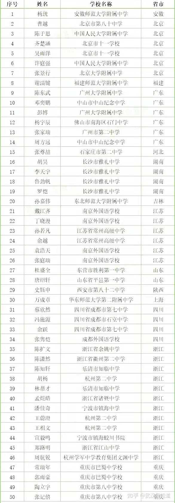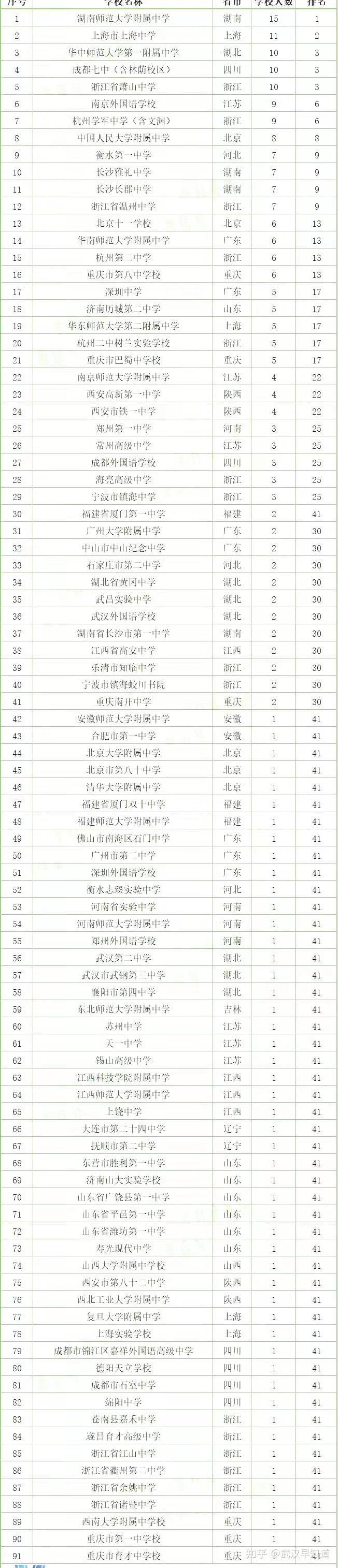 本次共有91所中学上榜,其中国集人数10人以上的5所,即前5名: