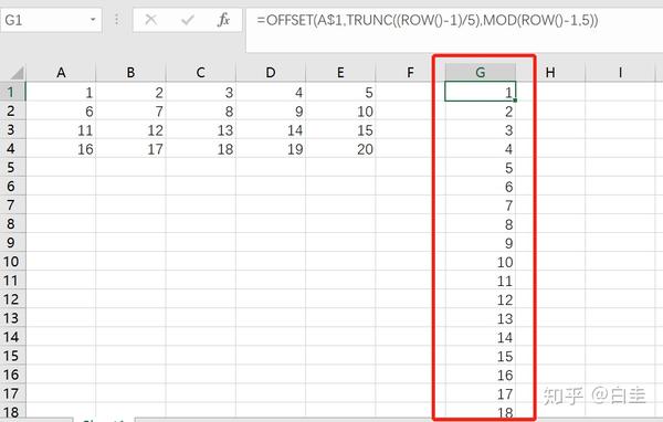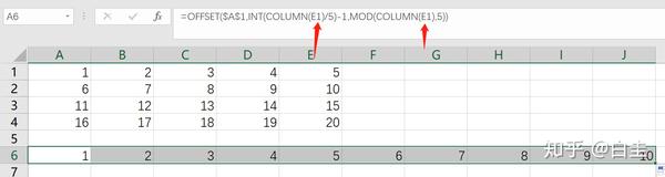 公式:=OFFSET(A$1,TRUNC((ROW()-1)/5),MOD(ROW()-1,5))
