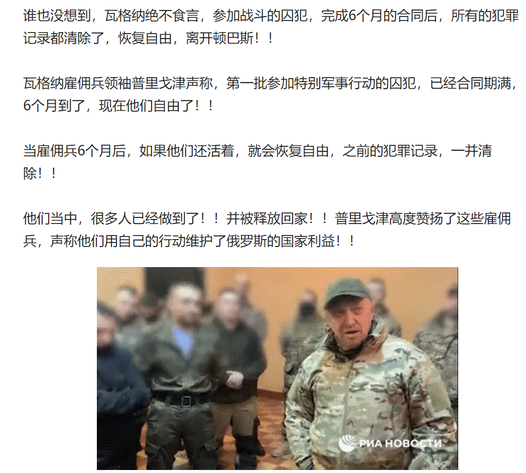“瓦格纳雇佣兵领袖普里戈津声称,第一批参加特别军事行动的囚犯,已经合同期满,6个月到了,现在他们自由了!!