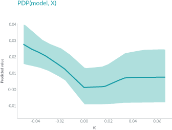 上面图中,轴表示特征的值,轴表示预测值。阴影区域中的实线显示了平均预测如何随着值的变化而变化。PDP能很直观地显示平均边际效应,因此可能会隐藏异质效应。