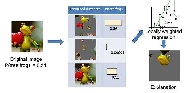 上面左边的图像被分成可解释的部分。然后,LIME 通过“关闭”一些可解释的组件(在这种情况下,使它们变灰)来生成扰动实例的数据集。对于每个扰动实例,可以使用经过训练的模型来获取图像中存在树蛙的概率,然后在该数据集上学习局部加权线性模型。最后,使用具有最高正向权重的成分来作为解释。