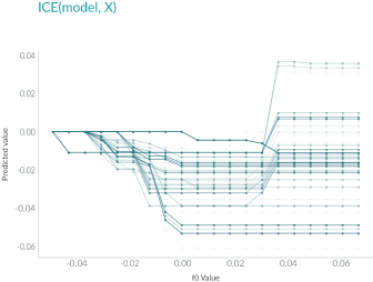 ICE和PDP非常相似,但和PDP不同之处在于,PDP绘制的是平均情况,但是ICE会显示每个实例的情况。ICE可以帮助我们解释一个特定的特征改变时,模型的预测会怎么变化。