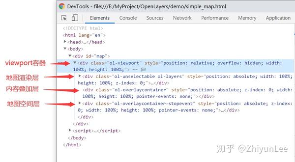 OpenLayers在自定义的div元素(id为map的div元素)中创建了一个viewport容器,这里存放着所有地图相关元素。