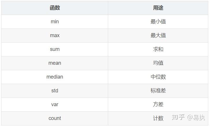 的朋友对此应该是非常熟悉了。聚合操作可以用来求和、均值、最大值、最小值等,下面的表格列出了Pandas中常见的聚合操作。