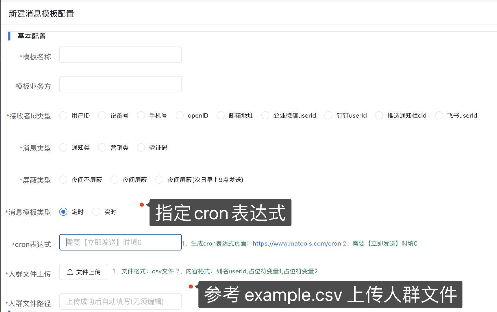 5 、亦可在新建模板时选择 定时任务 ,通过上传 csv文件 和指定cron表达式实现下发消息