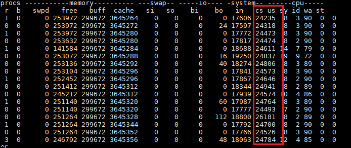 执行命令 vmstat 1,就可以看到整个操作系统每1秒CPU上下文切换的统计