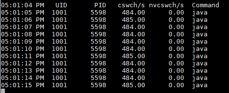 其中cswch表示主动切换,nvcswch表示被动切换。从统计数据中看到,该进程每秒主动切换次数达到将近500次,因此代码中存在大量的 睡眠\唤醒 操作。