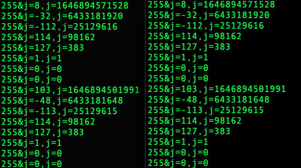 原以为大功告成,谁知道运算出的结果不一样,这是运算对比的截图(左边java,右边golang)