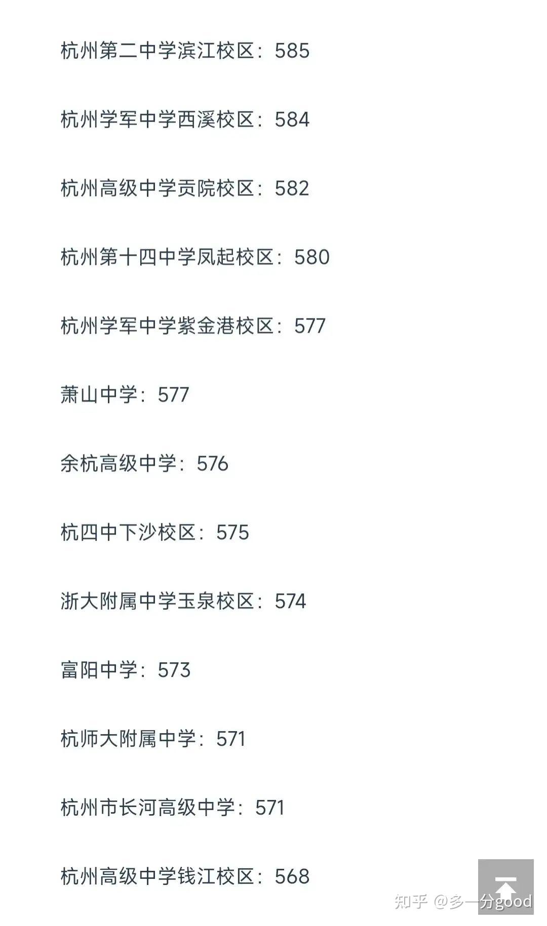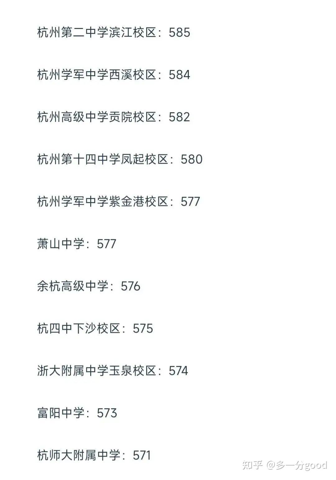 2022年,杭州市中考总分为600分,杭州市区各类高中第一批招生录取学校最低录取控制分数线为526分,按录取分数线从高到低公布如下: