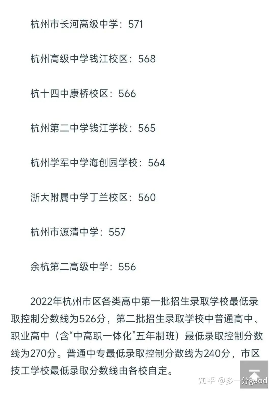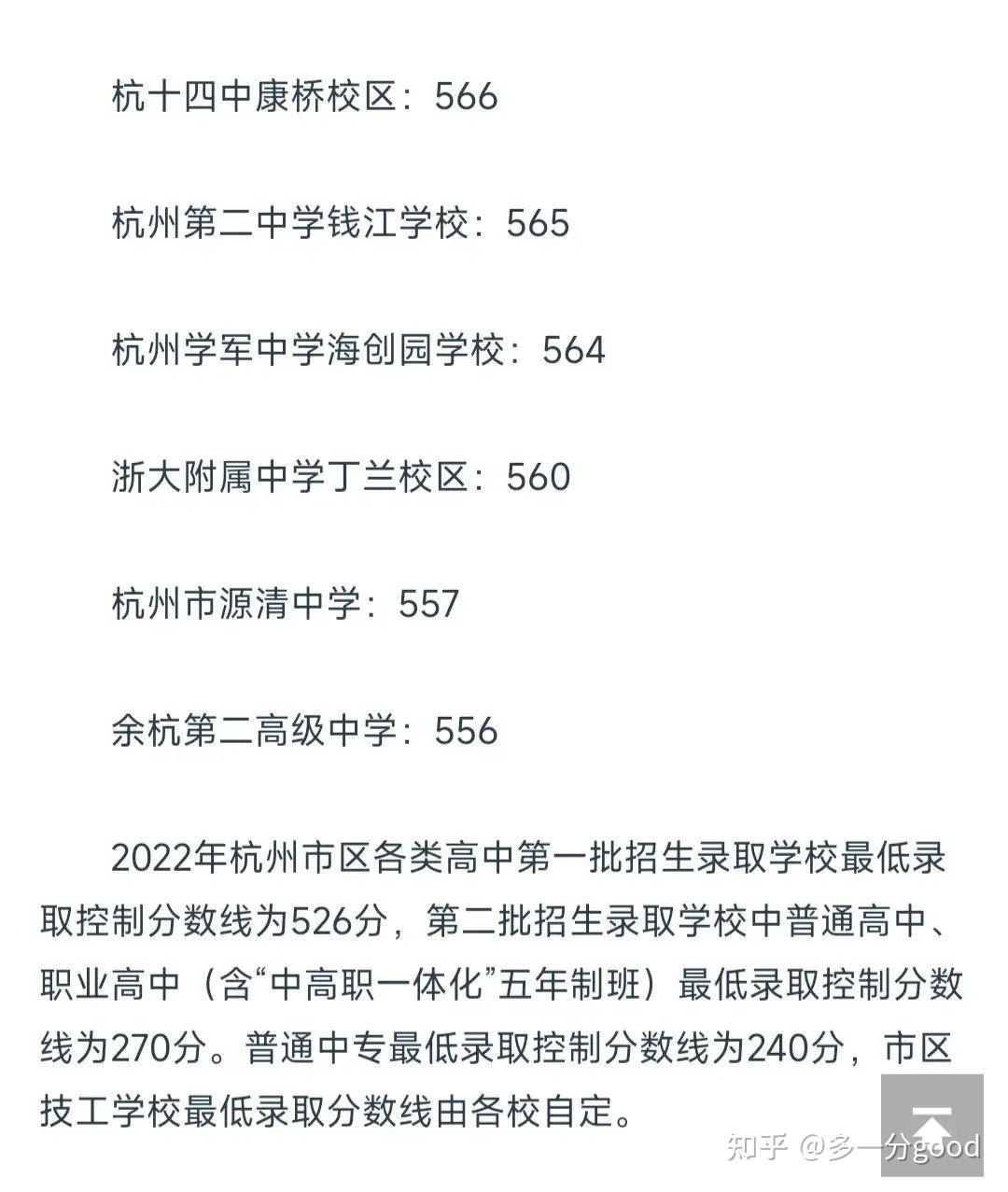 提醒考生:2022年杭州市区各类高中第一批招生录取学校最低录取控制分数线为526分,第二批招生录取学校中普通高中、职业高中(含“中高职一体化”五年制班)最低录取控制分数线为270分。普通中专最低录取控制分数线为240分,市区技工学校最低录取分数线由各校自定。