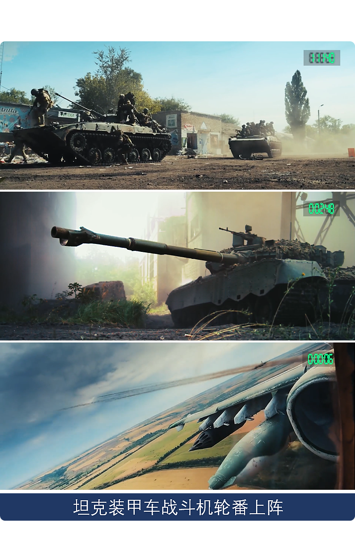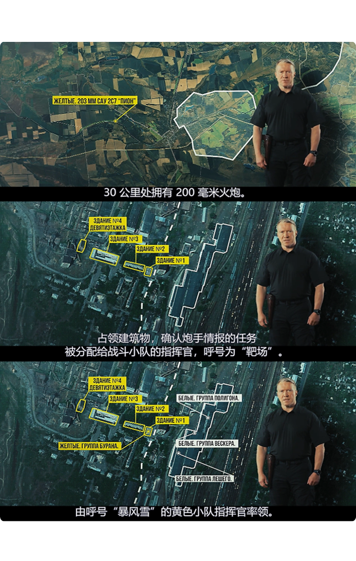 俄军进攻行动一开始就是紧张激烈的,有双方部署图,有战斗解说,有指挥体系,有真兵参演,堪似巷战教科书版一样的实训演练。同时俄军也体现出了专业的战斗素养和娴熟的经验技巧,例如利用波次小组交替前进、交叉火力掩护进攻、逐屋高爆破墙攻入、顽强的战斗意志和团结精神等,都令人拍手赞叹,为之称好。