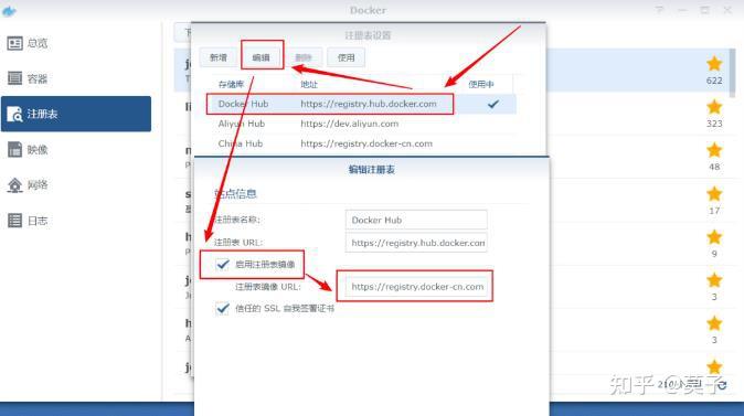 1、群晖docker——注册表——设置——选中Docker Hub——编辑——启用注册表镜像——在里面填写国内加速镜像地址: https:// registry.docker-cn.com ,然后重启docker