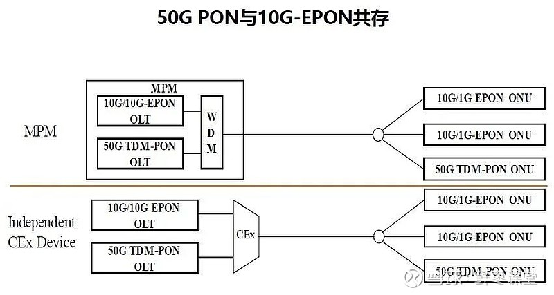 50G TDM PON和10G PON的共存演进升级原则上都是采用波分共存技术。
