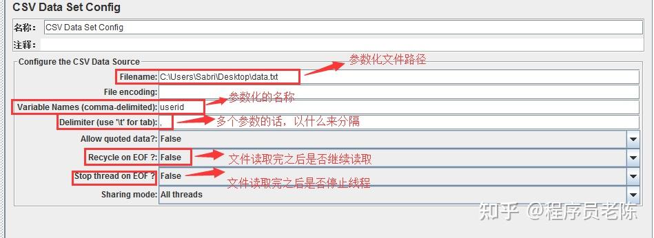 从文件读取的话,需要在线程组里面添加一个CSV Data Set Config,它就是做前面两步的操作的