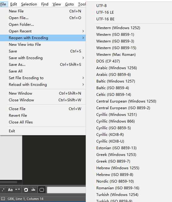 其中左边一个,右边一个。左边对应的是插件里的编码,右边对应的是sublime自带的。看你打开文件时使用了什么编码,如果是用GBK,那么右边显示的编码就完全没用不用看,如果是用reopen中的编码,则左边的不用看。