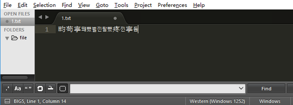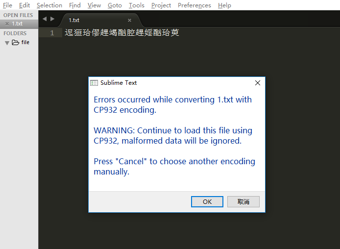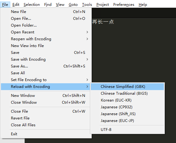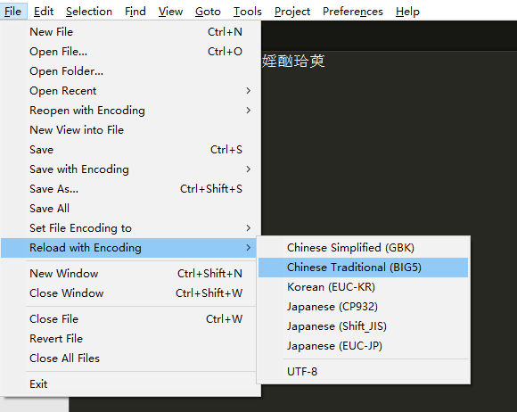 为了看使用不同编码方式打开结果,用sublime打开后可以点击 file-reload with encoding(没有这个选项的看下一部分)来更换编码方式,选择GBK(中文简体)就正常显示,选择BIG5(中文繁体)发现文本乱码了,选择CP932(日文)报错了。