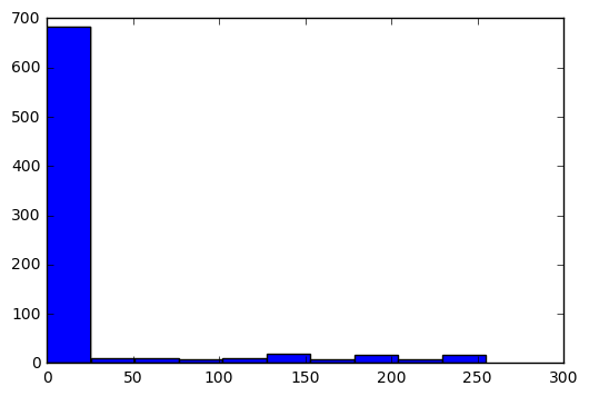 Out[4]: (array([ 682., 9., 10., 7., 10., 18., 7., 17., 7., 17.]),