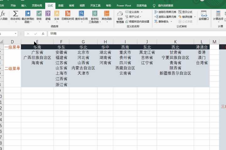 1、选定一二级菜单项所在单元格区域。