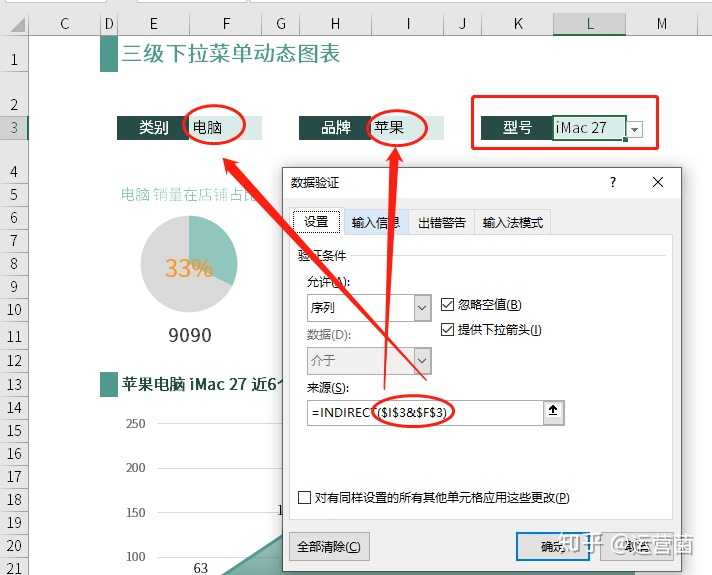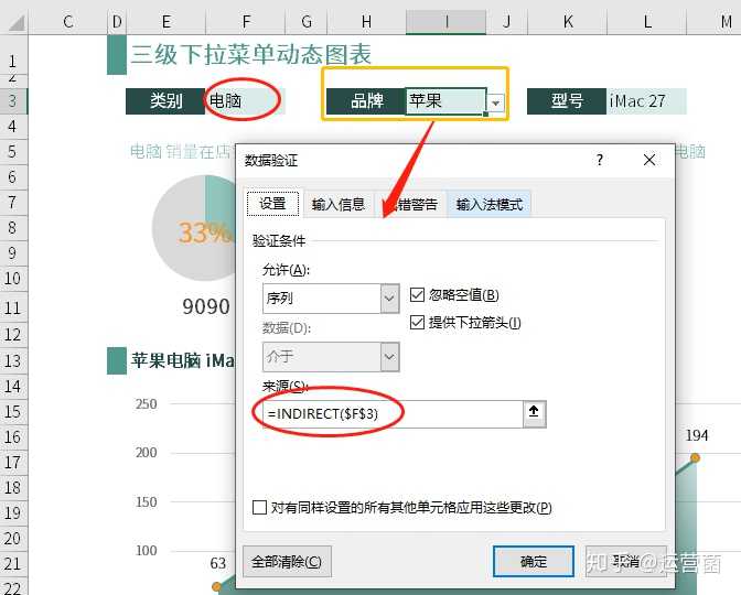 4、单击二级菜单项所在目标单元格,【数据】-【数据验证】,选择【允许】中的【序列】,在【来源】中输入公式:=indirect($h$3)并【确定】。