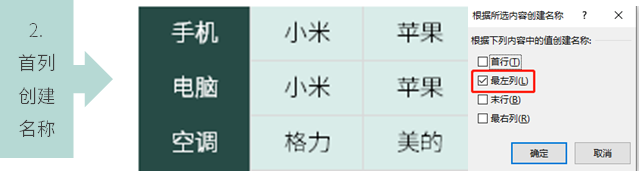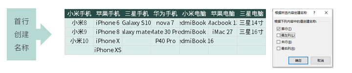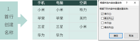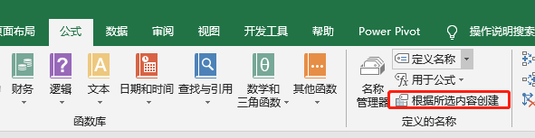 3、【公式】-【根据所选内容创建】,选定【首行】-【确定】。