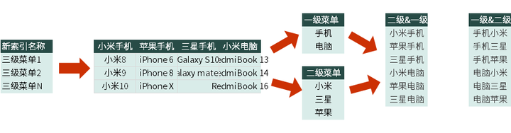 2、将二级菜单整理在同一行,在同一列中列出三级菜单项。如下图。