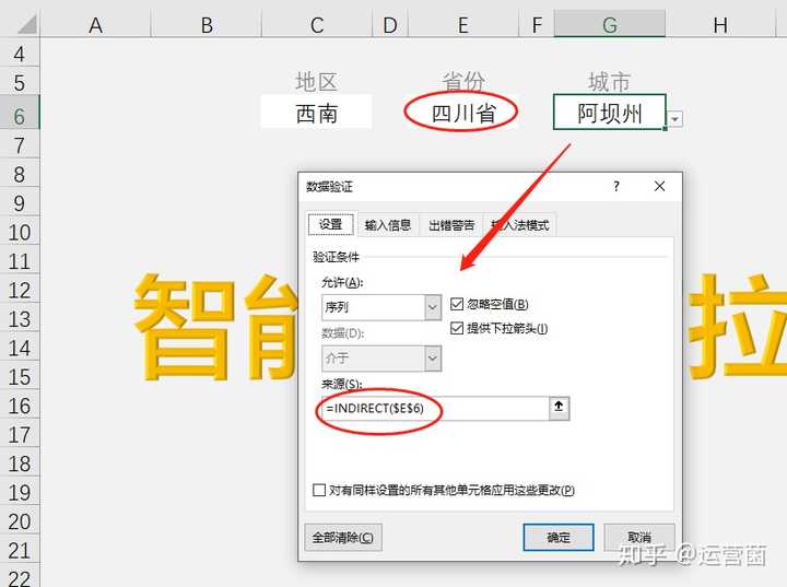 4、单击二级菜单项所在目标单元格,【数据】-【数据验证】,选择【允许】中的【序列】,在【来源】中输入公式:=indirect($g$3)并【确定】。