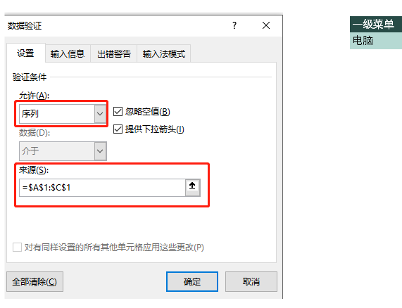 2、【数据】-【数据验证】,选择【允许】中的【序列】,在【来源】中输入:=$B$2:$D$2(B2:D2为一级菜单所在的单元格区域,需要绝对引用)。