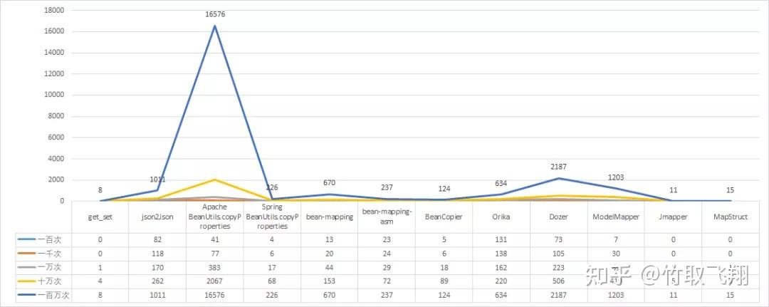 目前我整理出,用于对象属性转换有12种,包括:普通的getset、json2Json、Apache属性拷贝、Spring属性拷贝、bean-mapping、bean-mapping-asm、BeanCopier、Orika、Dozer、ModelMapper、JMapper、MapStruct 接下来我们分别测试这11种属性转换操作分别在一百次、一千次、一万次、十万次、一百万次时候的性能时间对比。